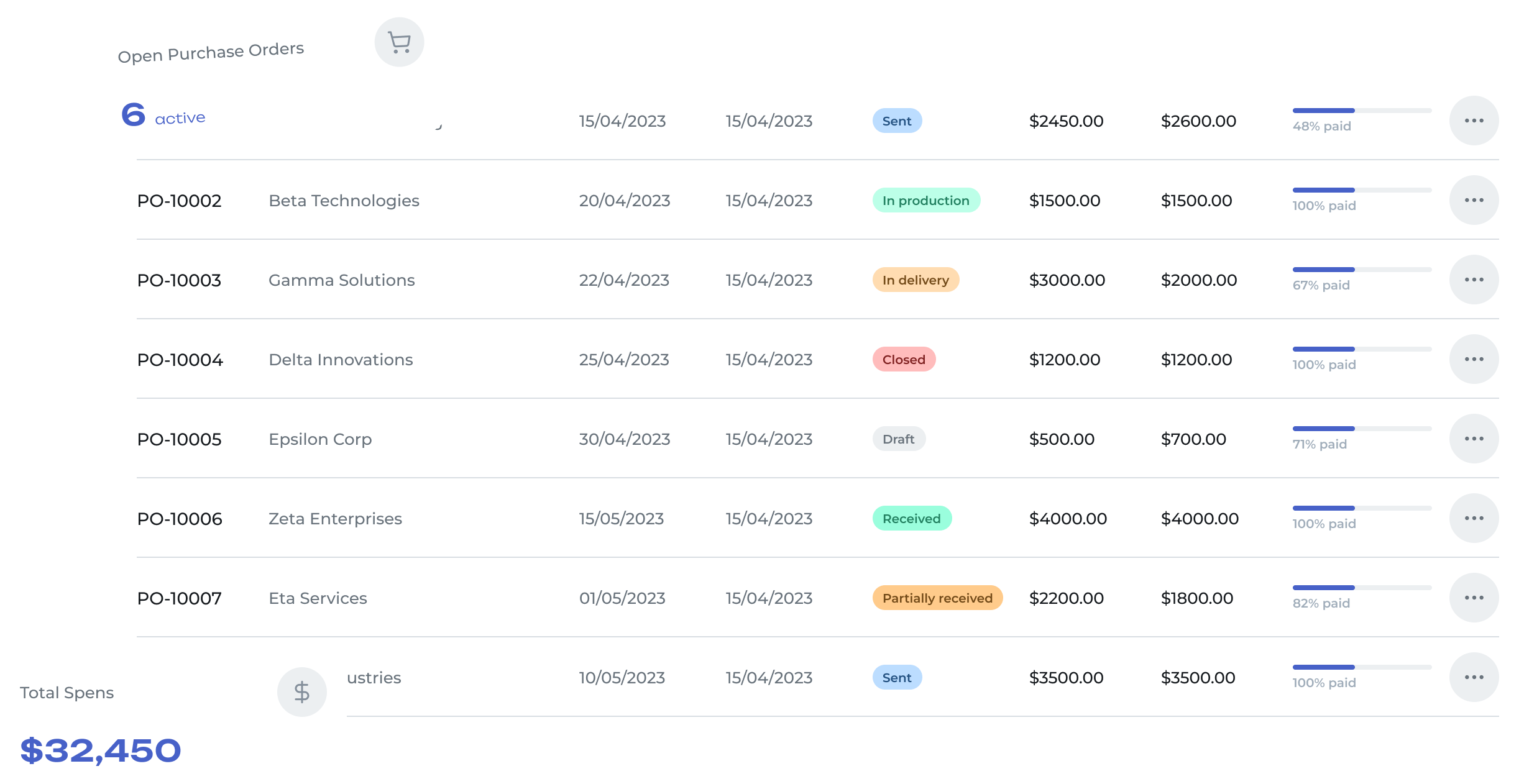 Get a clear view of all open orders — including their status, expected delivery, costs, and payment progress — all in one centralized dashboard.
