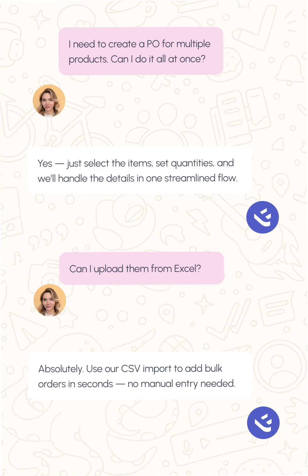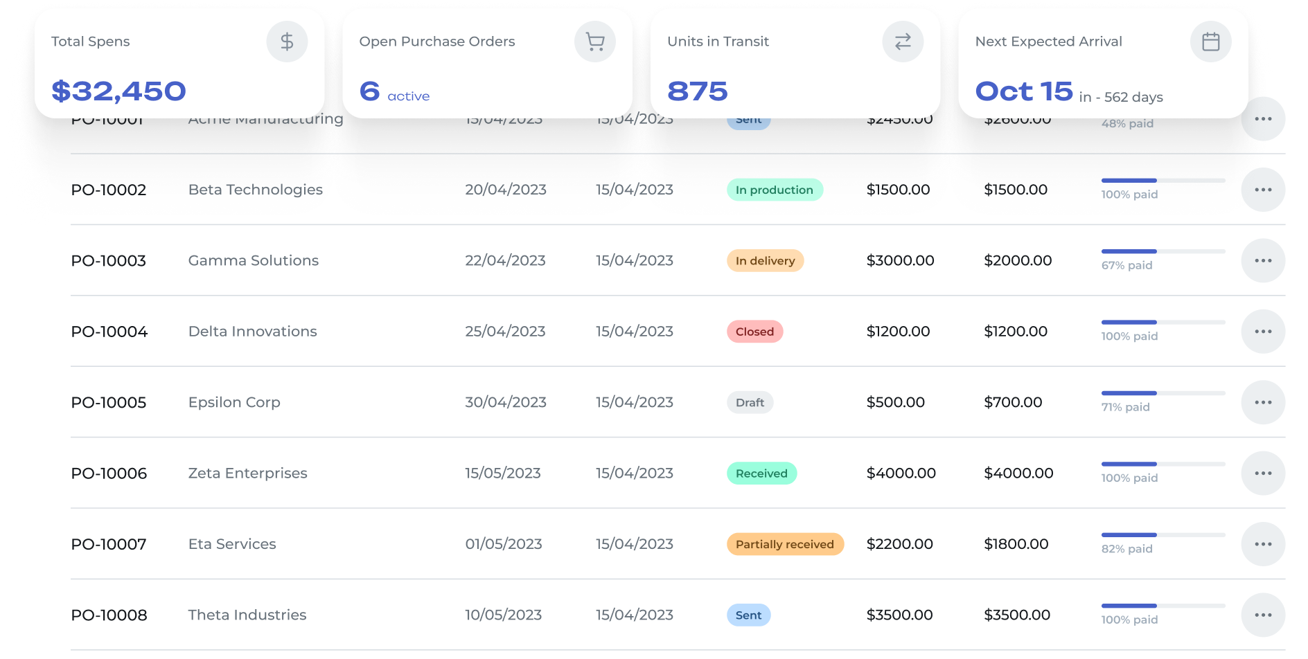 Track all orders, suppliers, statuses, and payments in one place. Stay on top of every PO without digging through emails or spreadsheets.