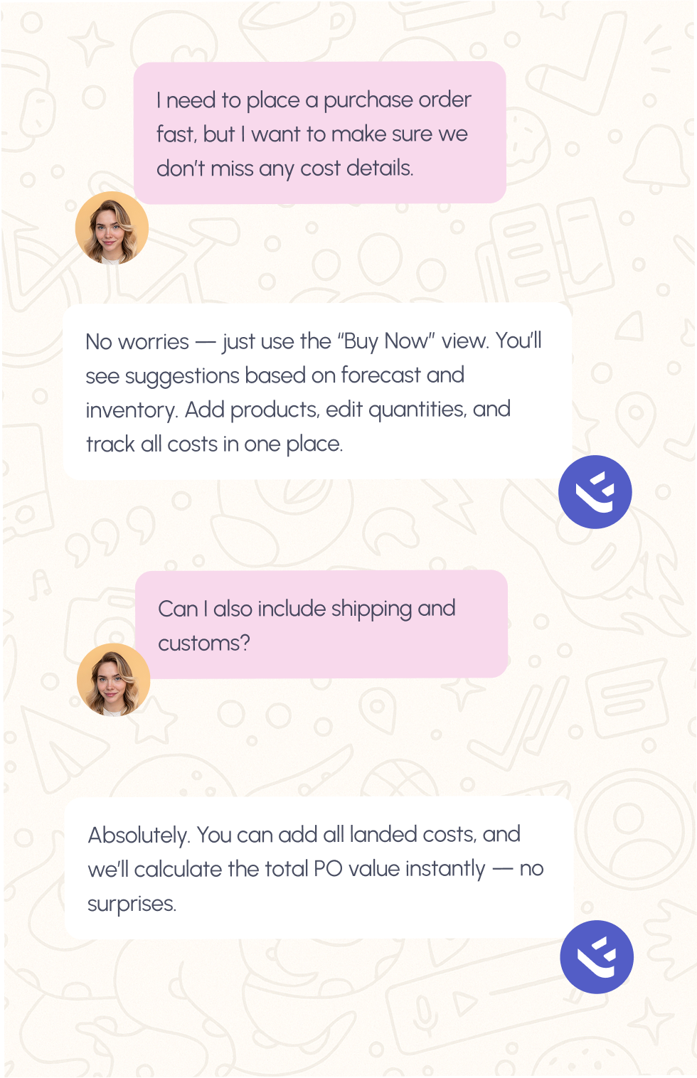 Everything you need for purchasing — in one screen. From basic order details to landed cost calculations. Build POs in minutes, not hours.