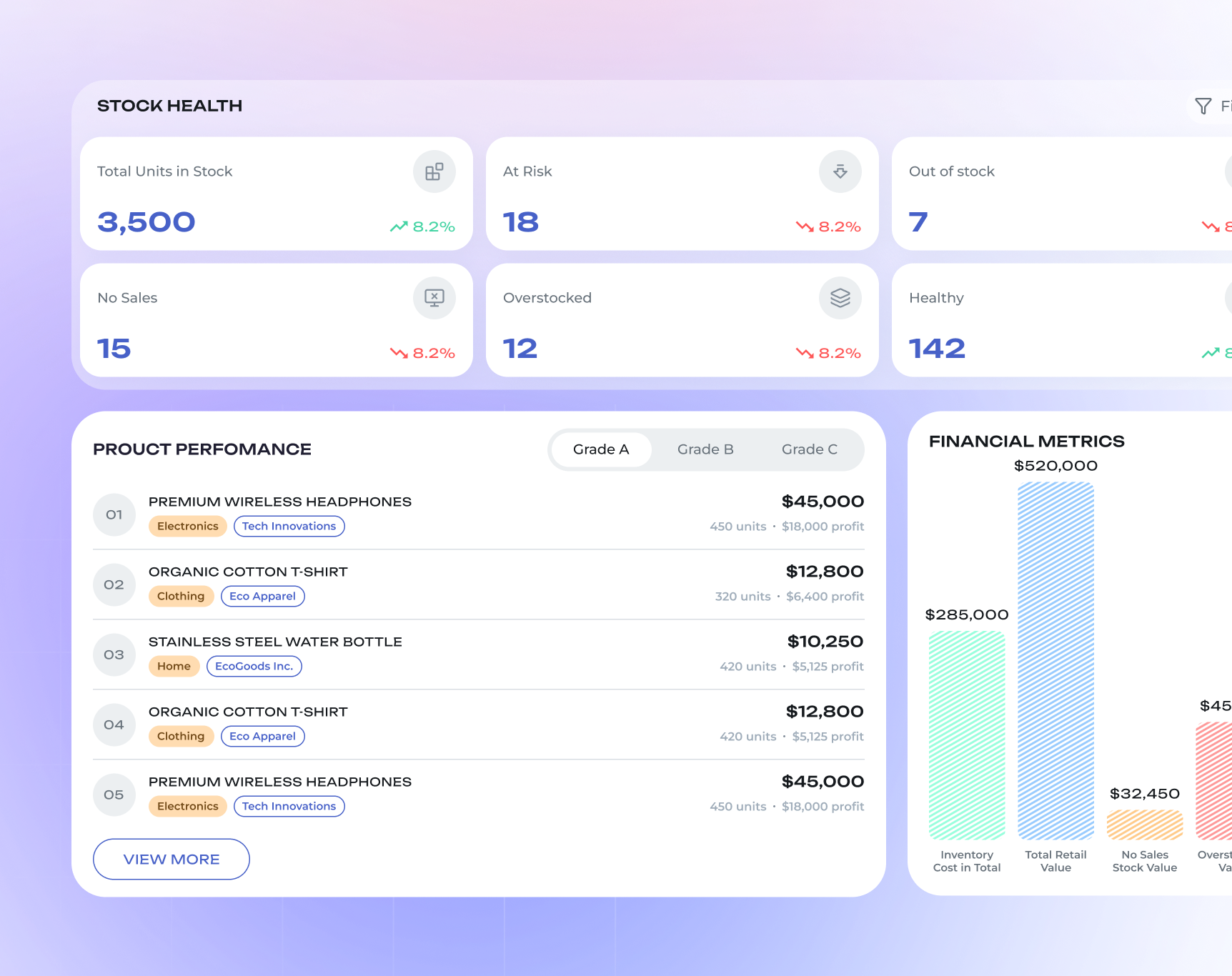 Get a clear, real-time overview of your inventory health, supplier performance, and open purchase orders, all in one place.